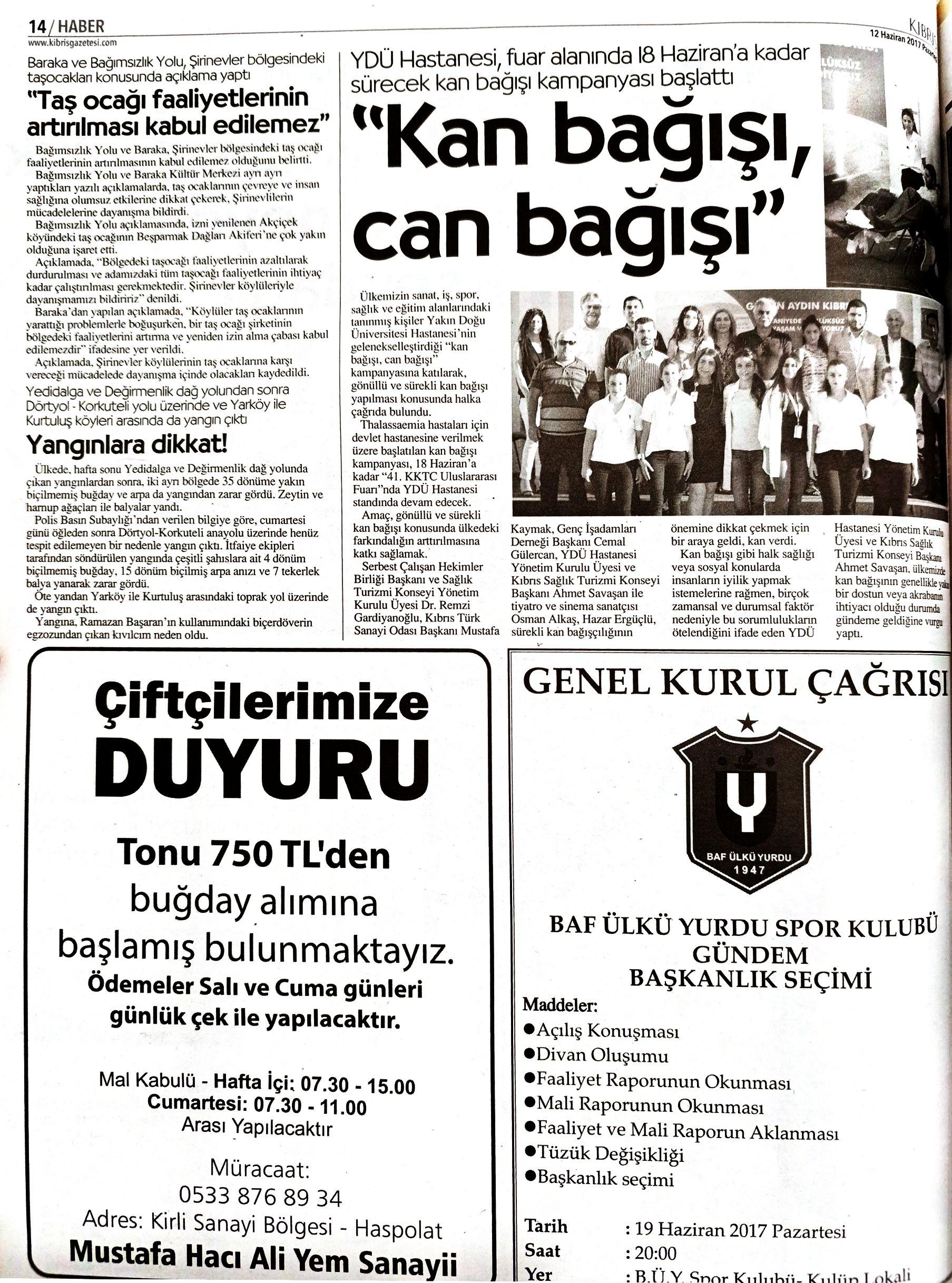 Serbest Çalışan Hekimler Birliği Başkanı ve Sağlık Turizmi Konseyi Yönetim Kurulu Üyesi Dr. Remzi Gardiyanoğlu, Kıbrıs Türk Sanayi Odası Başkanı Mustafa Kaymak, Genç İşadamları Derneği Başkanı Cemal Gülercan, YDÜ Hastanesi Yönetim Kurulu Üyesi ve Kıbrıs Sağlık Turizmi Konseyi Başkanı Ahmet Savaşan ile tiyatro ve sinema sanatçısı Osman Alkaş, Hazar Ergüçlü, sürekli kan bağışçılığının önemine dikkat çekmek için bir araya geldi, kan verdi.