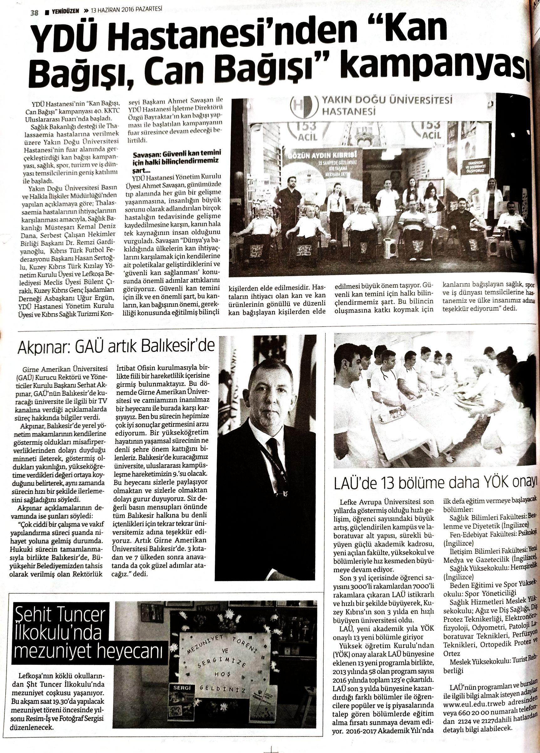 Yakın Doğu Üniversitesi Basın ve Halkla İlişkiler Müdürlüğü’nden yapılan açıklamaya göre; Thalassaemia hastalarının ihtiyaçlarının karşılanması amacıyla, Sağlık Bakanlığı Müsteşarı Kemal Deniz Dana, Serbest Çalışan Hekimler Birliği Başkanı Dr. Remzi Gardiyanoğlu, Kıbrıs Türk Futbol Federasyonu Başkanı Hasan Sertoğlu, Kuzey Kıbrıs Türk Kızılay Yönetim Kurulu Üyesi ve Lefkoşa Belediyesi Meclis Üyesi Bülent Çıraklı, Kuzey Kıbrıs Genç İşadamları Derneği Asbaşkanı Uğur Ergün, YDÜ Hastanesi Yönetim Kurulu Üyesi ve Kıbrıs Sağlık Turizmi Konseyi Başkanı Ahmet Savaşan ile YDÜ Hastanesi İşletme Direktörü Özgü Bayraktar’ın kan bağışı yapması ile başlatılan kampanyanın fuar süresince devam edeceği belirtildi.